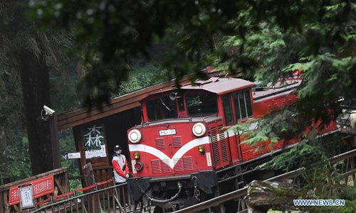 A train runs in the forests of Ali Mountain in Taiwan, southeast China, Oct. 7, 2019. Many tourists take the train on the Ali Mountain for sightseeing. (Xinhua/Chen Bin)