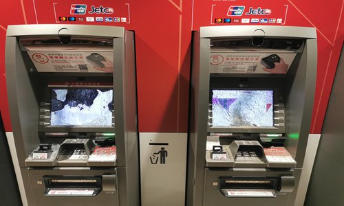 ATMs of a mainland bank in Hong Kong are damaged by rioters during the weekend. Photo: Chen Qingqing/GT