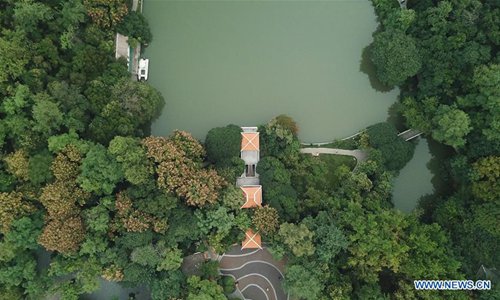 Aerial photo taken on Oct. 8, 2019 shows a view at Huancheng Park in Hefei, capital of east China's Anhui Province. (Xinhua/Zhang Duan)