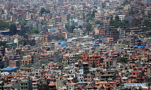 Photo taken on July 11, 2019 shows a residential area as seen from hill of Kirtipur in Kathmandu, capital of Nepal. The World Population Day is observed on July 11 every year. The population of Nepal is currently around 30 million. Photo:Xinhua