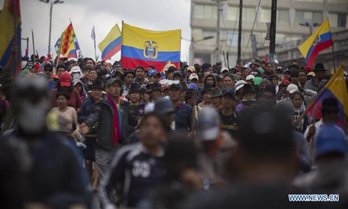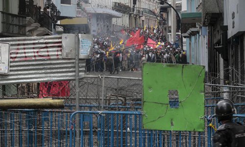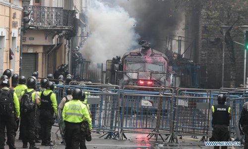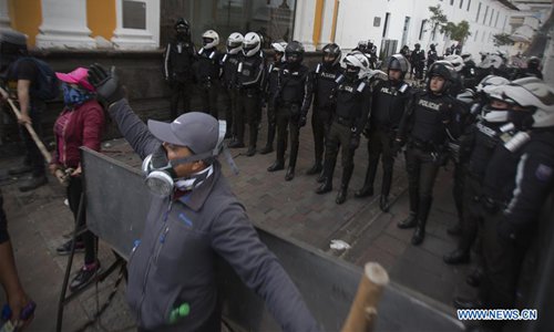 Protesters confront the police in Quito, Ecuador, on Oct. 9, 2019. The Ecuadorian government Tuesday said it has asked the United Nations to help restore social peace as demonstrations over a fuel price hike intensified. (Str/Xinhua)