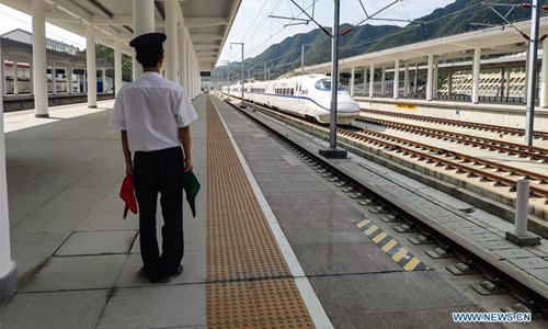A bullet train passes Bijie Railway Station during a test run on the Xingwen-Guiyang section of the Chengdu-Guiyang railway in southwest China's Guizhou Province, Oct. 9, 2019. The 632-kilometer Chengdu-Guiyang railway is a key constituent of China's high-speed railway network, linking the capital of Sichuan Province and the capital of Guizhou Province with a design speed of 250 kilometers per hour. Sections of the railway in Sichuan are already in use, while the whole line will be in operation by the end of this year. (Xinhua/Tao Liang)