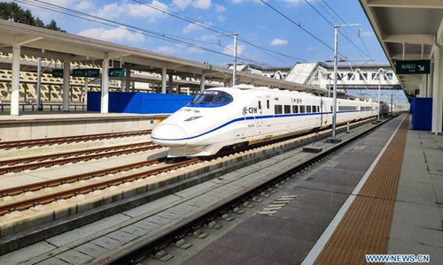 A bullet train passes Bijie Railway Station during a test run on the Xingwen-Guiyang section of the Chengdu-Guiyang railway in southwest China's Guizhou Province, Oct. 9, 2019. (Xinhua/Tao Liang)