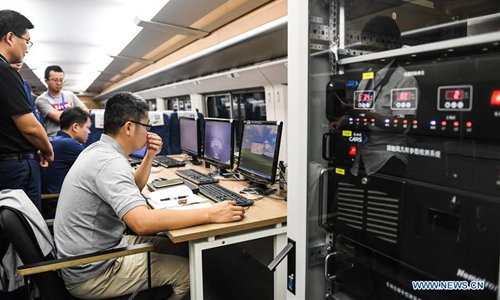 Staff members work aboard a bullet train during a test run on the Xingwen-Guiyang section of the Chengdu-Guiyang railway in southwest China, Oct. 9, 2019. (Xinhua/Tao Liang)