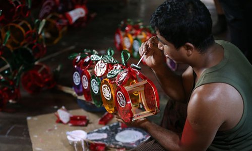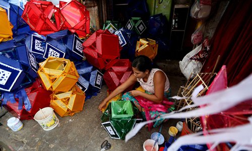 A worker arranges toy lanterns at a workshop in Yangon, Myanmar, Oct. 3, 2019. (Photo by U Aung/Xinhua)