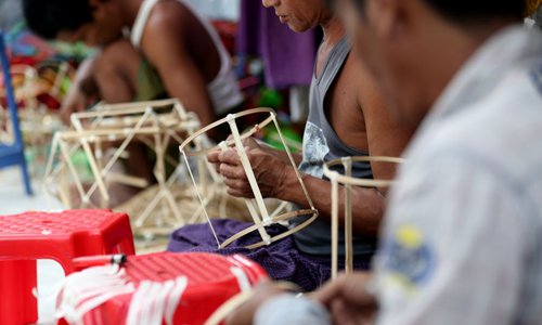 Workers curve lantern shapes at a workshop in Yangon, Myanmar, Oct. 4, 2019. (Photo by U Aung/Xinhua)