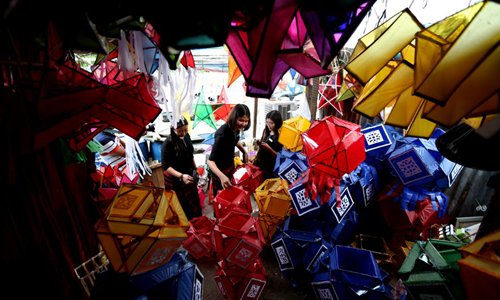 Customers select lanterns at a workshop in Yangon, Myanmar, Oct. 4, 2019. (Photo by U Aung/Xinhua)