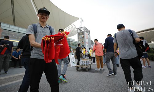 The NBA pre-season game between the Brooklyn Nets and Los Angeles Lakers is held at the Mercedes-Benz Cultural Center in Shanghai on Wednesday night. Chinese fans distribute the national flag ahead of the game as a fan is seen holding a jersey asking Daryl Morey to resign. (Photo: Yang Hui/GT)