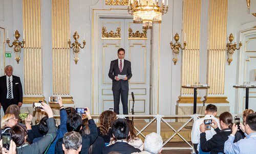 Swedish Academy Permanent Secretary Mats Malm announces two laureates of the Nobel Prize in Literature at a press conference at the Stockholm Stock Exchange on Thursday. Polish author Olga Tokarczuk received the prize for 2018 and Austrian author Peter Handke for 2019.Photo: VCG