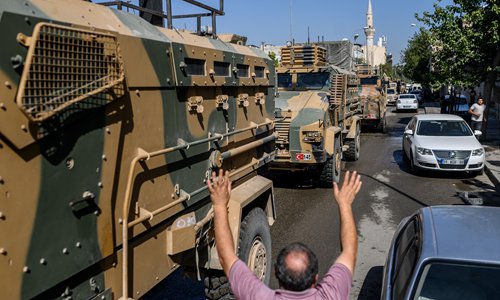 A man waves as Turkish armored vehicles escort members of the Turkish-backed Free Syrian Army, a militant group active in parts of northwest Syria, as they cross the Turkey-Syria border on Thursday, in Akcakale, Turkey. Photo: AFP