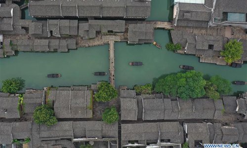 Aerial photo taken on Oct. 12, 2019 shows scenery in the river town of Wuzhen in Tongxiang, East China's Zhejiang Province. (Xinhua)