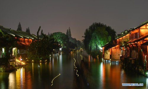 Photo taken on Oct. 11, 2019 shows a night view of the river town of Wuzhen in Tongxiang, East China's Zhejiang Province. (Xinhua)