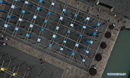 Aerial photo taken on Oct. 12, 2019 shows tourists visiting a dyeing workshop in the river town of Wuzhen in Tongxiang, East China's Zhejiang Province. (Xinhua)