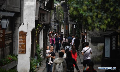 Tourists visit the river town of Wuzhen in Tongxiang, East China's Zhejiang Province, Oct. 12, 2019. (Xinhua)