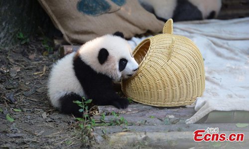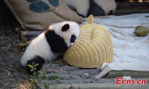 A giant panda cub spends quite some time playing with a basket at the Chengdu Research Base of Giant Panda Breeding in Chengdu, capital of Southwest China's Sichuan Province, Oct. 11, 2019. The research base ranked second after the Palace Museum in the list of top 10 most-viewed scenic spots of China, receiving nearly 7.5 million visitors in 2018, Xinhua reported. (Photo: China News Service)