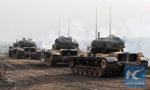 Turkish army tanks are seen in Afrin, Syria, on Jan. 22, 2018. (Xinhua)