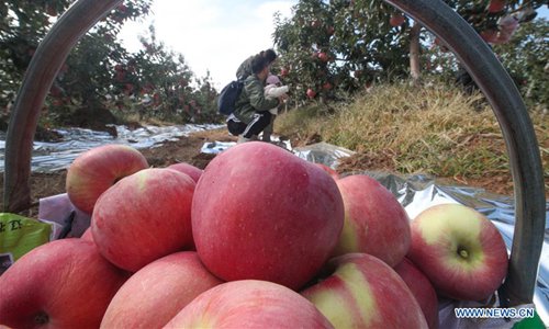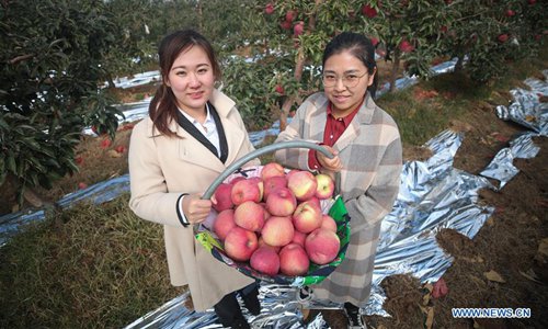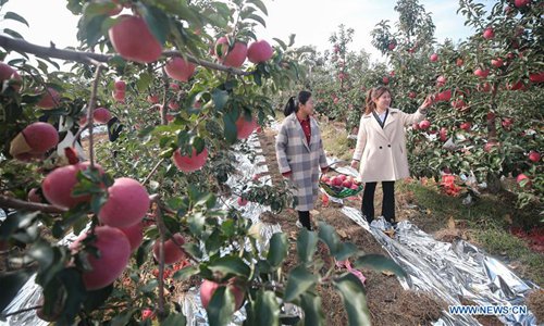 Tourists pick apples at an orchard during an apple harvest festival in Fangjiatun Township, northeast China's Liaoning Province, Oct. 13, 2019. Home to about 12,000 mu (about 800 hectares) of apple orchards, Fangjiatun has witnessed great progress in poverty alleviation in recent years. (Xinhua)