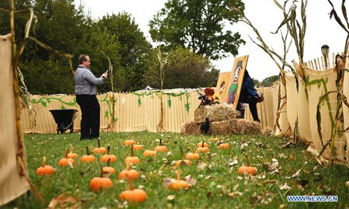 Visitors take photos at the Pumpkin Patch in Queens Botanical Garden in New York, the United States, Oct. 12, 2019. Pumpkin patch activities were held here to celebrate the autumn harvest over the weekend, including harvest-themed photo opportunities, pumpkin decorating, crafts, mini-maze and botanical demonstrations. (Xinhua)