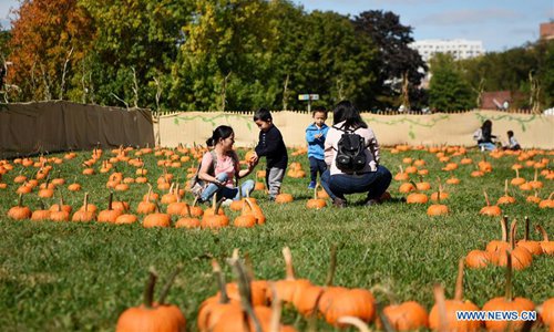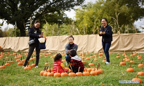 Visitors have fun at the Pumpkin Patch in Queens Botanical Garden in New York, the United States, Oct. 12, 2019. Pumpkin patch activities were held here to celebrate the autumn harvest over the weekend, including harvest-themed photo opportunities, pumpkin decorating, crafts, mini-maze and botanical demonstrations. (Xinhua)