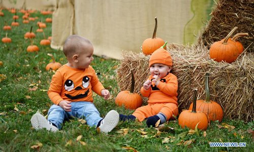 Kids have fun at the Pumpkin Patch in Queens Botanical Garden in New York, the United States, Oct. 12, 2019. Pumpkin patch activities were held here to celebrate the autumn harvest over the weekend, including harvest-themed photo opportunities, pumpkin decorating, crafts, mini-maze and botanical demonstrations. (Xinhua)
