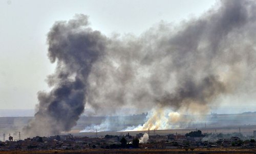Photo taken from southern Turkish border town of Ceylanpinar on Oct. 12, 2019 shows smoke rising from the northern Syrian city of Ras al-Ain during an attack launched by Turkish army. (Photo by Mustafa Kaya/Xinhua)