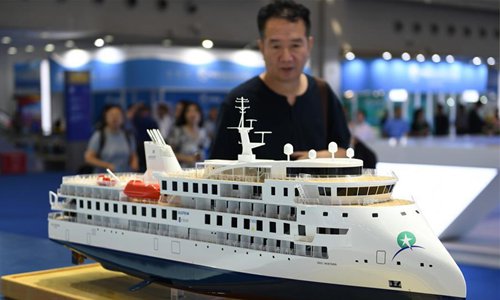 A visitor looks at the model of the Greg Mortimer, China's first self-made cruise ship for polar expeditions, at the 2019 China Marine Economy Expo in Shenzhen, south China's Guangdong Province, Oct. 15, 2019. The expo, under the theme of "Sharing Blue Economy Opportunities, Building a Shared Future," opened here on Tuesday. It has attracted more than 450 companies and institutions to participate and is expected to present China's achievements in the marine economy and the latest progress in the global marine industry. (Xinhua/Mao Siqian)