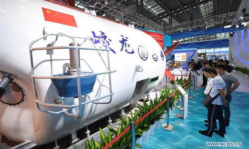 Visitors look at the model of the China's manned submersible Jiaolong at the 2019 China Marine Economy Expo in Shenzhen, south China's Guangdong Province, Oct. 15, 2019. The expo, under the theme of "Sharing Blue Economy Opportunities, Building a Shared Future," opened here on Tuesday. It has attracted more than 450 companies and institutions to participate and is expected to present China's achievements in the marine economy and the latest progress in the global marine industry. (Xinhua/Mao Siqian)