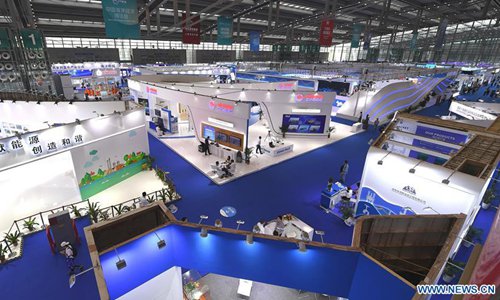 People visit the 2019 China Marine Economy Expo in Shenzhen, south China's Guangdong Province, Oct. 15, 2019. The expo, under the theme of "Sharing Blue Economy Opportunities, Building a Shared Future," opened here on Tuesday. It has attracted more than 450 companies and institutions to participate and is expected to present China's achievements in the marine economy and the latest progress in the global marine industry. (Xinhua/Mao Siqian)