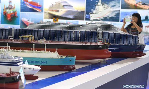 A visitor takes photo of vessel models at the booth of the China State Shipbuilding Corporation at the 2019 China Marine Economy Expo in Shenzhen, south China's Guangdong Province, Oct. 15, 2019. The expo, under the theme of "Sharing Blue Economy Opportunities, Building a Shared Future," opened here on Tuesday. It has attracted more than 450 companies and institutions to participate and is expected to present China's achievements in the marine economy and the latest progress in the global marine industry. (Xinhua/Mao Siqian)