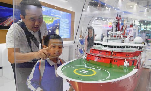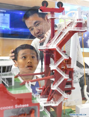 Visitors look at a model of the deep-water engineering vessel at the booth of the China National Offshore Oil Corporation at the 2019 China Marine Economy Expo in Shenzhen, south China's Guangdong Province, Oct. 15, 2019. The expo, under the theme of "Sharing Blue Economy Opportunities, Building a Shared Future," opened here on Tuesday. It has attracted more than 450 companies and institutions to participate and is expected to present China's achievements in the marine economy and the latest progress in the global marine industry. (Xinhua/Mao Siqian)