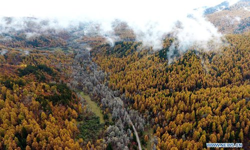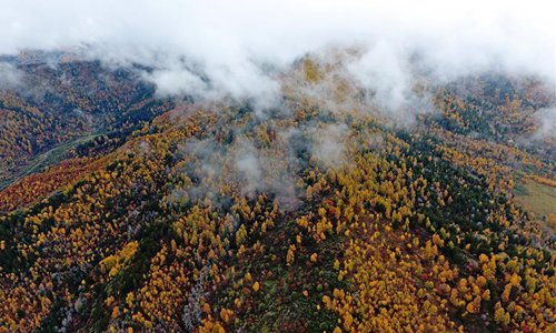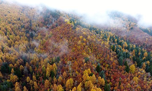 Aerial photo taken on Oct. 16, 2019 shows a view of the Pangquangou nature reserve in north China's Shanxi Province. (Xinhua/Zhan Yan)
