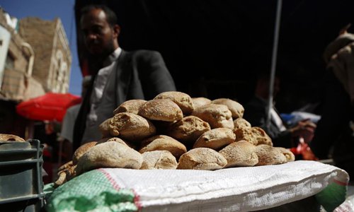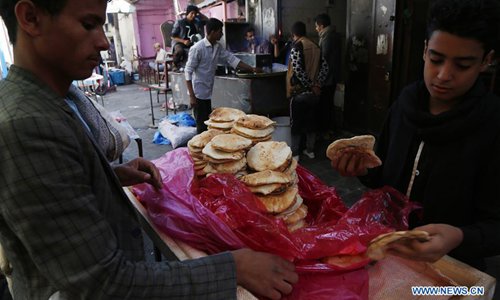A man walks past bread for sale in Sanaa, Yemen, Oct. 16, 2019, the World Food Day. The long-running conflict has caused the world's worst humanitarian crisis. Currently, some 24 million Yemenis, or 80 percent of the population, need humanitarian aid and protection, with some 20 million lacking food security, according to previous UN statistics. (Photo by Mohammed Mohammed/Xinhua)