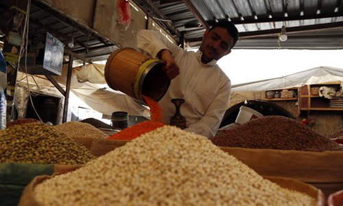 A Yemeni grain vendor waits for customers in Sanaa, Yemen, Oct. 16, 2019, the World Food Day. The long-running conflict has caused the world's worst humanitarian crisis. Currently, some 24 million Yemenis, or 80 percent of the population, need humanitarian aid and protection, with some 20 million lacking food security, according to previous UN statistics. (Photo by Mohammed Mohammed/Xinhua)