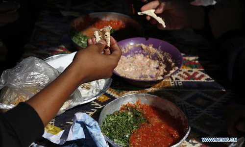 Yemeni people have their breakfast at a restaurant in Sanaa, Yemen, Oct. 16, 2019, the World Food Day. The long-running conflict has caused the world's worst humanitarian crisis. Currently, some 24 million Yemenis, or 80 percent of the population, need humanitarian aid and protection, with some 20 million lacking food security, according to previous UN statistics. (Photo by Mohammed Mohammed/Xinhua)