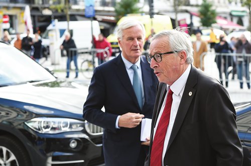 European Commission President Jean-Claude Juncker (right) and EU chief Brexit negotiator Michel Barnier arrive for a European Union Summit at European Union Headquarters in Brussels on Thursday. EU and British negotiators struck a deal Thursday to split Britain from the European Union. Photo: AFP