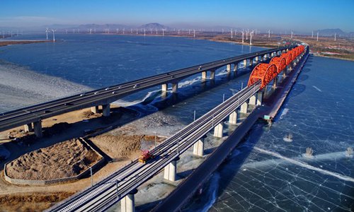 Aerial photo taken on Jan. 13, 2019 shows workers laying tracks for the Beijing-Zhangjiakou high-speed railway line at Guanting Reservoir grand bridge in north China's Hebei Province. (Xinhua/Yang Shiyao)