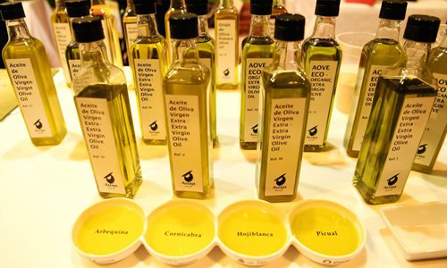 Olive oil bottles are presented at the World Olive Oil Exhibition in Madrid, Spain, on March 21, 2018. (Xinhua/Guo Qiuda)