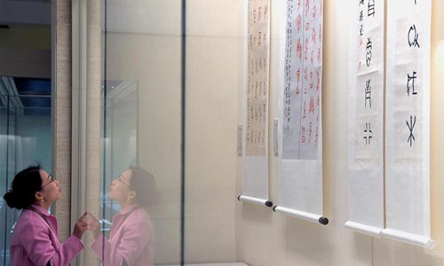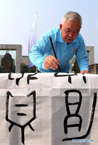 Chinese calligraphy enthusiasts demonstrate Chinese calligraphy featuring oracle bone inscriptions at National Museum of Chinese Writing in Anyang, central China's Henan Province, Oct. 18, 2019. (Xinhua/Li An)