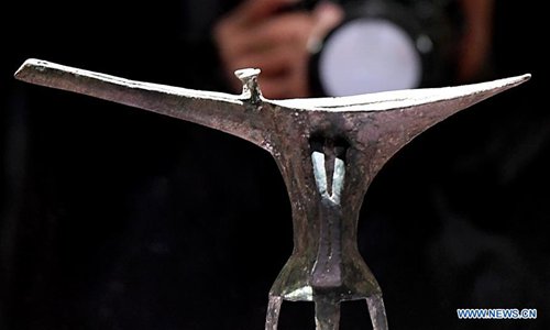 A visitor takes pictures of a bronze ware exhibit at the Erlitou Relic Museum in Luoyang, central China's Henan Province, Oct. 19, 2019. The Erlitou Relic Museum, which exhibits the history of ancient China's first recorded dynasty of Xia (2070-1600 B.C.), opened Saturday in Luoyang. It exhibits over 2,000 items, including bronze wares, pottery wares and jade wares. Covering an area of 32,000 square meters, the museum exhibits the history of the Xia Dynasty, the first dynasty recorded in ancient China. Construction of the museum cost 630 million yuan (about 89 million U.S. dollars). The Erlitou Relics date back to 3,500 to 3,800 years ago in ancient China's late Xia or early Shang (1600-1046 B.C.) dynasties. (Xinhua/Li An)