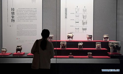 A visitor views ding exhibits, tripod cooking vessels widely used in prehistoric China, at the Erlitou Relic Museum in Luoyang, central China's Henan Province, Oct. 19, 2019. The Erlitou Relic Museum, which exhibits the history of ancient China's first recorded dynasty of Xia (2070-1600 B.C.), opened Saturday in Luoyang. It exhibits over 2,000 items, including bronze wares, pottery wares and jade wares. Covering an area of 32,000 square meters, the museum exhibits the history of the Xia Dynasty, the first dynasty recorded in ancient China. Construction of the museum cost 630 million yuan (about 89 million U.S. dollars). The Erlitou Relics date back to 3,500 to 3,800 years ago in ancient China's late Xia or early Shang (1600-1046 B.C.) dynasties. (Xinhua/Li An)