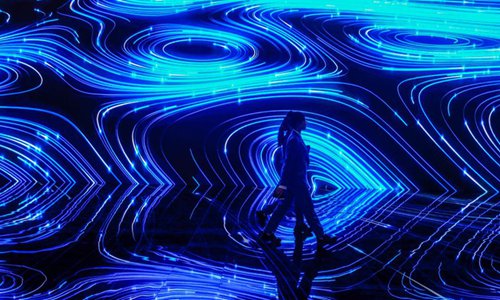 Staff members walk by a giant screen in Wuzhen International Internet Exhibition and Convention Center in Wuzhen, east China's Zhejiang Province, Oct. 19, 2019. The 6th World Internet Conference is scheduled to take place here from Oct. 20 to 22.Photo:Xinhua