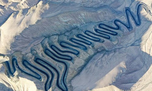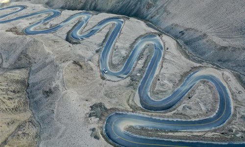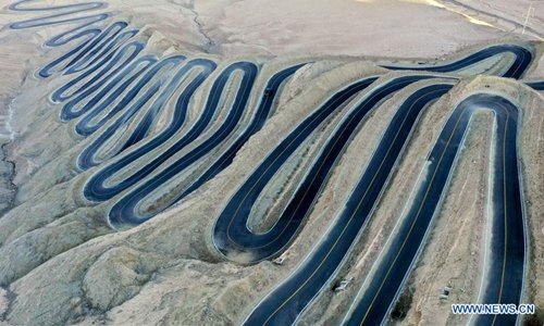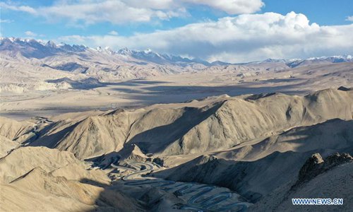 Aerial photo taken on Oct. 20, 2019 shows a view of a mountain road in Tajik Autonomous County of Taxkorgan, northwest China's Xinjiang Uygur Autonomous Region. The road, constructed on the Pamir Plateau at an altitude of more than 4,200 meters with a 1,000-meter drop in height, is hailed as the "plateau sky road" by local residents. (Xinhua/Ding Lei)