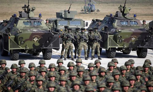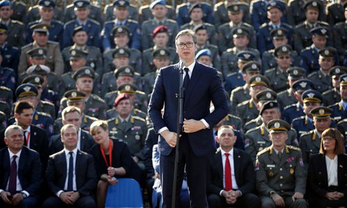 Serbian President Aleksandar Vucic (C) speaks during the "Freedom 2019" military show at the military airport Batajnica, in Belgrade, Serbia. (Photo by Predrag Milosavljevic/Xinhua)