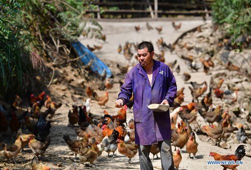 Villagers feed chickens at a village of Dapo Township under Rong'an County in Liuzhou, south China's Guangxi Zhuang Autonomous Region, Oct. 16, 2019. In recent years, the local authorities of Rong'an County has been developing the free-range chicken farming as an important means to help lift impoverished households out of poverty. The government provides subsidies, free training and technical guidance for villagers. (Xinhua/Huang Xiaobang)