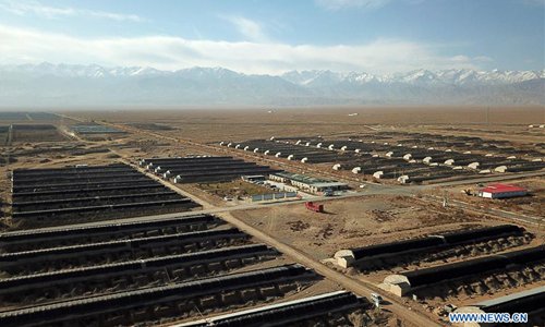 Aerial photo taken on Oct. 22, 2019 shows greenhouses in Dongdong Town, Suzhou District of Jiuquan City, northwest China's Gansu province. Local authorities develop the gobi desert agriculture as a way to boost locals' income and local economy. The planting area of gobi desert agriculture in Suzhou District has reached 5,672 mu (about 378 hectares) in the year 2019, increasing the total area of gobi desert agriculture to 25,000 mu (about 1667 hectares). (Xinhua/Ma Ning)