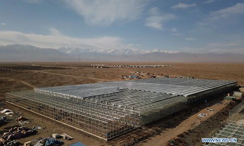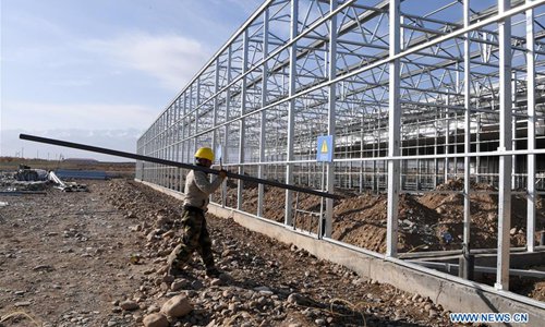 A worker works at a smart multi-span greenhouse construction site in Dongdong Town, Suzhou District of Jiuquan City, northwest China's Gansu province, Oct. 22, 2019. Local authorities develop the gobi desert agriculture as a way to boost locals' income and local economy. The planting area of gobi desert agriculture in Suzhou District has reached 5,672 mu (about 378 hectares) in the year 2019, increasing the total area of gobi desert agriculture to 25,000 mu (about 1667 hectares). (Xinhua/Ma Ning)