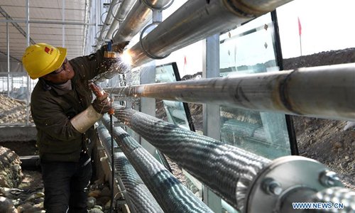 A man works at a smart multi-span greenhouse construction site in Dongdong Town, Suzhou District of Jiuquan City, northwest China's Gansu province, Oct. 22, 2019. Local authorities develop the gobi desert agriculture as a way to boost locals' income and local economy. The planting area of gobi desert agriculture in Suzhou District has reached 5,672 mu (about 378 hectares) in the year 2019, increasing the total area of gobi desert agriculture to 25,000 mu (about 1667 hectares). (Xinhua/Ma Ning)