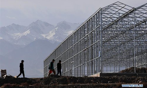 Workers build a smart multi-span greenhouse construction site in Dongdong Town, Suzhou District of Jiuquan City, northwest China's Gansu province, Oct. 22, 2019. Local authorities develop the gobi desert agriculture as a way to boost locals' income and local economy. The planting area of gobi desert agriculture in Suzhou District has reached 5,672 mu (about 378 hectares) in the year 2019, increasing the total area of gobi desert agriculture to 25,000 mu (about 1667 hectares). (Xinhua/Ma Ning)