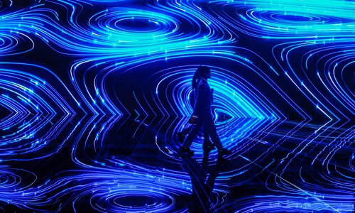 People walk before a screen in the Wuzhen International Internet Exhibition and Convention Center in the river town of Wuzhen, east China's Zhejiang Province, Oct. 19, 2019. (Xinhua/Xu Yu)