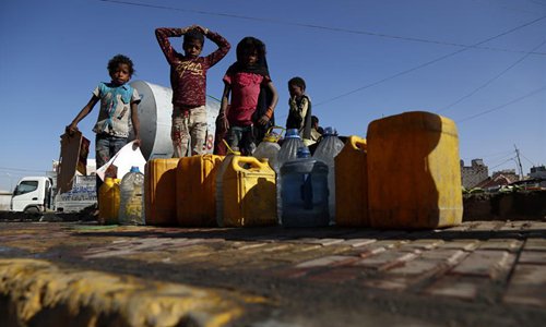 Children take turns to fetch water from a charity tap in Sanaa, Yemen, on Oct. 22, 2019. (Photo by Mohammed Mohammed/Xinhua)